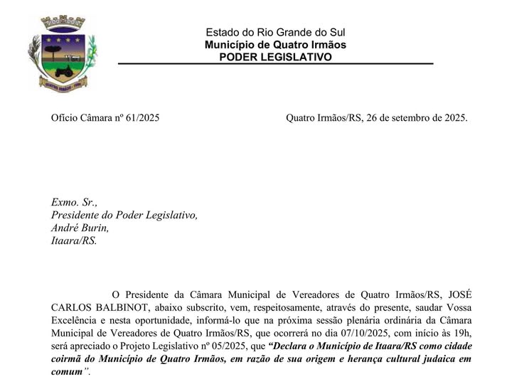As cidades de Itaara/RS e Quatro Irmãos/RS serão coirmãs pelo advento da imigração judaica que formou a base de ambos municípios.